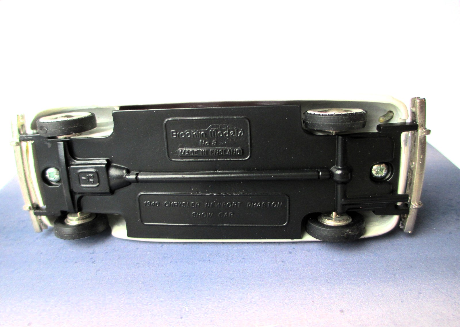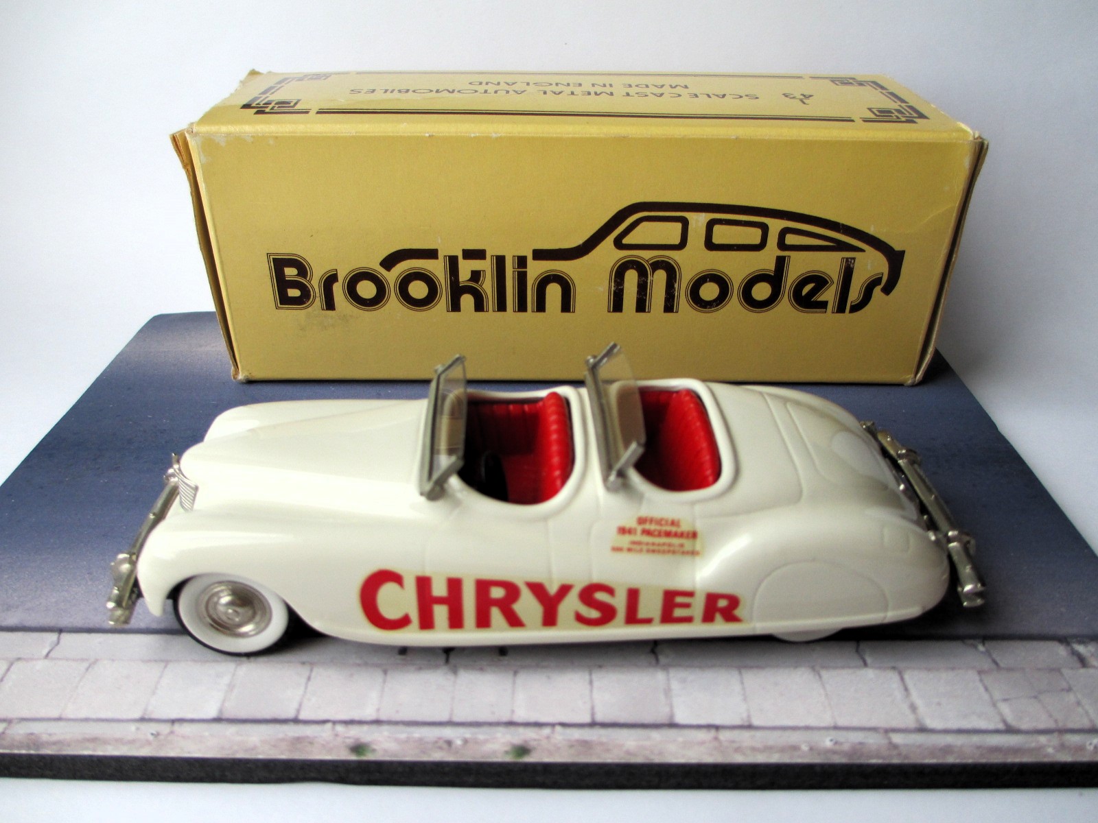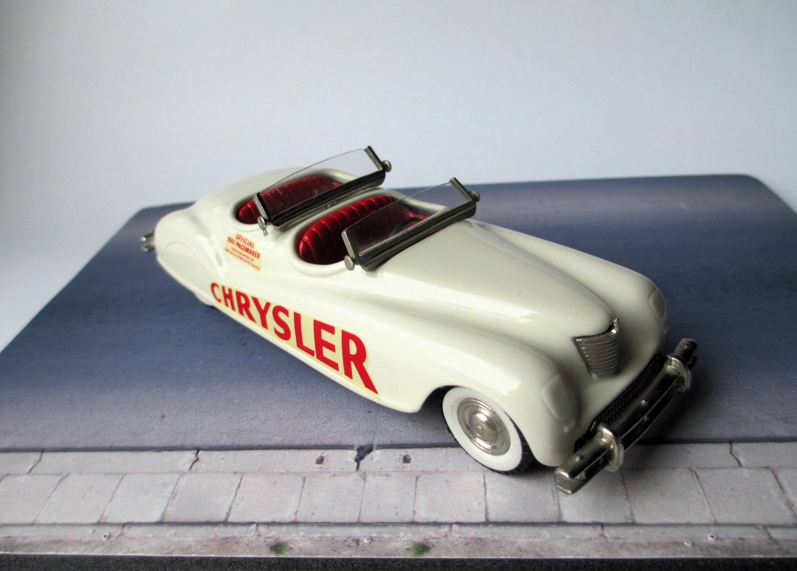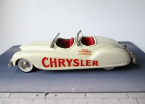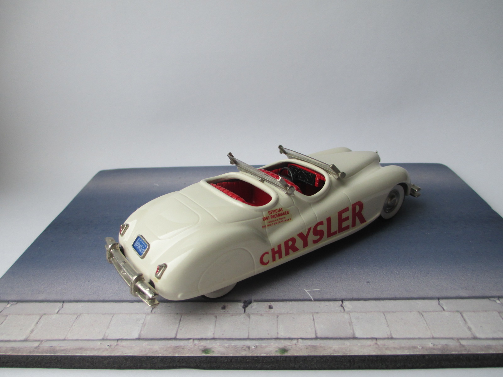 1940 Chrysler Newport Brooklin models (BRK 8 A) Pace car Indy 500 30th May 1941 Winners – Floyd Davis / Mauri Rose Pace Car Driver – A. B. Couture * Белый металл. Сделано в Англии. Последняя предвоенная Инди. И в последний раз, когда победители делили машину (Wetteroth - Offenhauser) на двоих. Фаэтон с двойным капотом, оснащенный рядным восьмицилиндровым двигателем Chrysler «Spitfire» объемом 323,5 куб. дюймов (5,3 л) с двумя карбюраторами, соединенным с трехступенчатой механической коробкой передач. После гонки автомобиль стал личной собственностью Уолтера П. Крайслера-младшего. Про водителя пейс кара мне ничего толком неизвестно. Уже старый Бруклин (80-е годы). Но сохранился хорошо. Есть пара микротрещин на ЛКП. Для большой машины модель не тяжёлая. Наверное потому, что без крыши. Вес модели 269 грамм. Именно с этой модели началось мое второе (маленькое) пришествие в коллекционирование. Купил "на пробу". Хотелось непосредственно убедиться в необычности, брутальности и тяжести. Мой белометальный Lotus 91 T - Austrian GP 1982 - Tameo (TMK 127), который достался от Миши Комина много лет назад не в счёт.