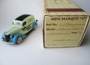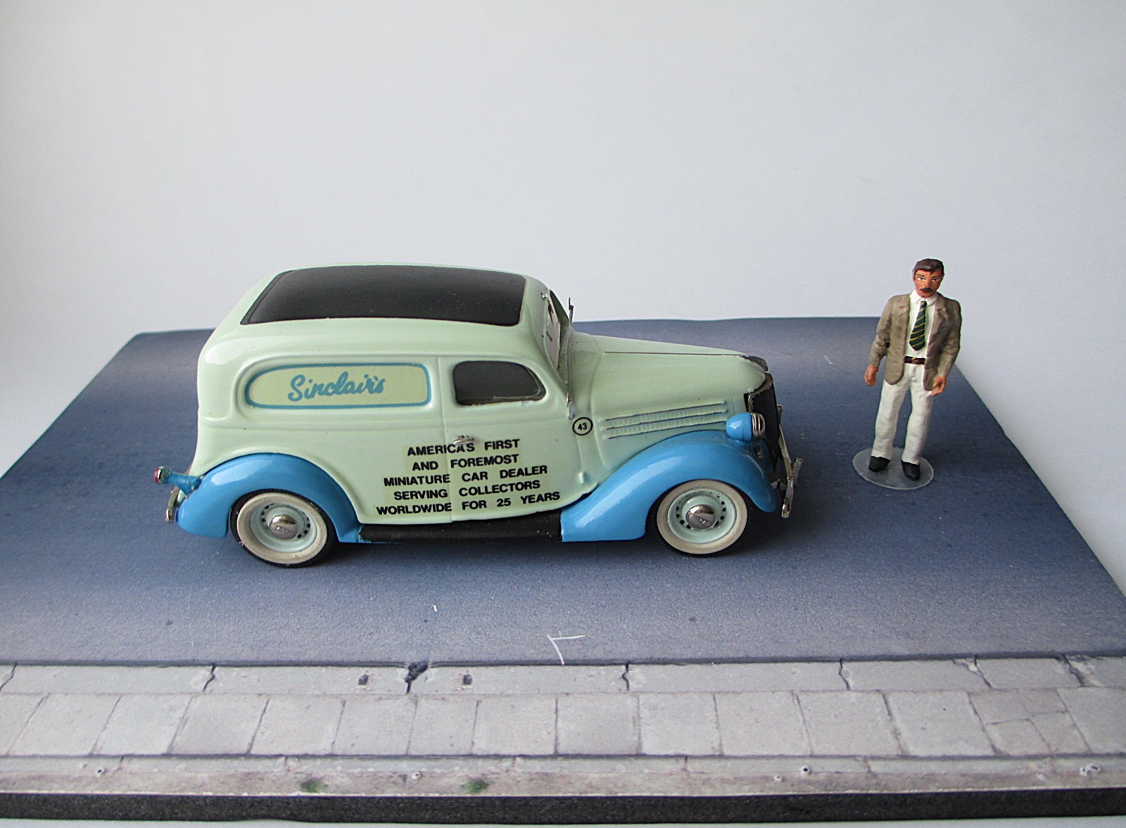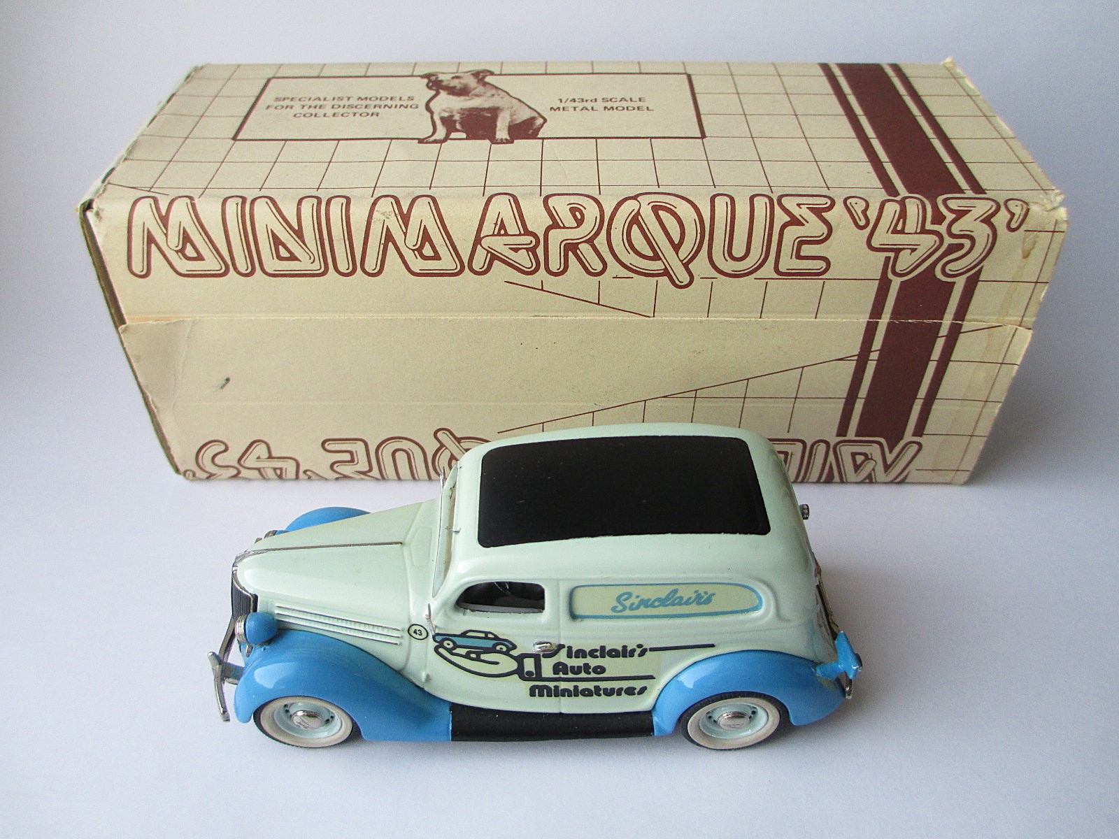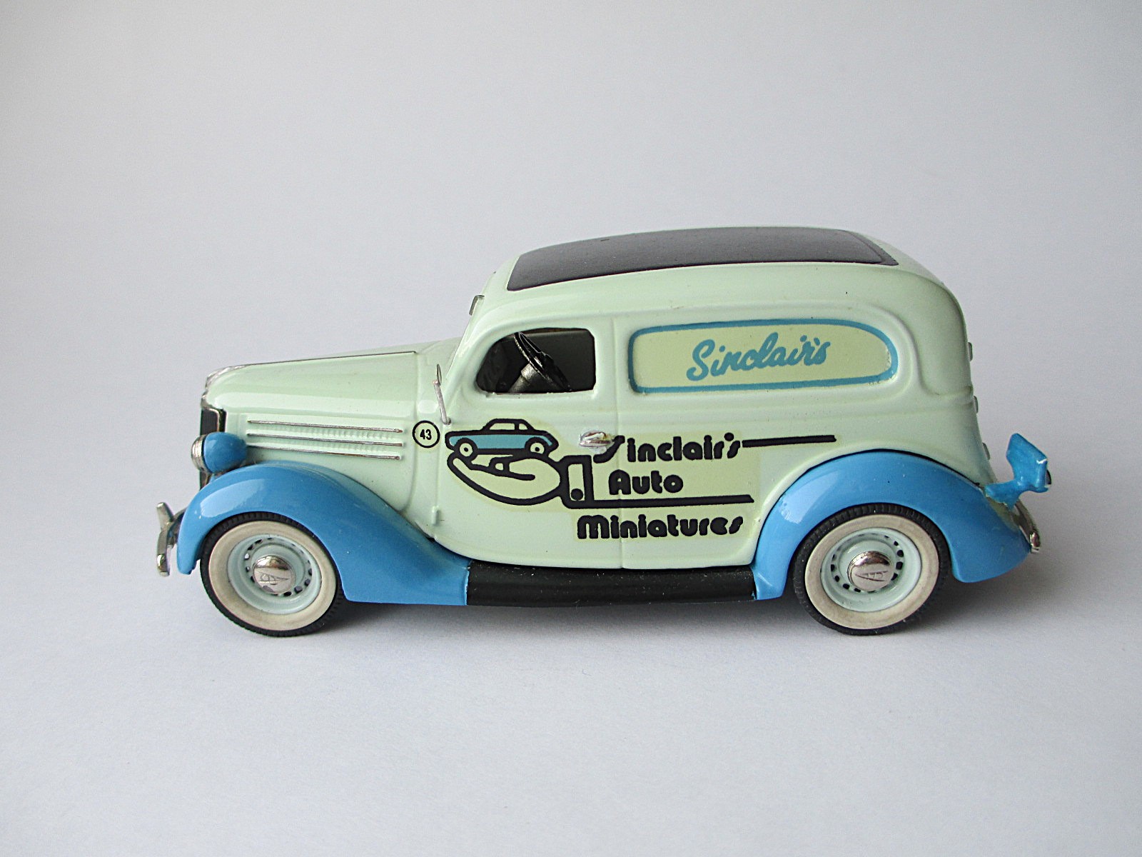 Ford V 8 Sedan Delivery Mini Marque (LTD MM 43/4) Почти совсем свежее поступление. Есть более интересные модели, но пока продолжим вот с этим: В технические характеристики автомобиля углубляться не будем. Технических инноваций там нет. Зато! при поиске информации про этот Форд помощник Алиса AI выдаёт вот такие "пёрлы" в характеристиках этого авто: Особенности: улучшенная подвеска, кожаный интерьер, электрические окна, стерео AM/FM с Bluetooth. Прелестно! Соврёшь - недорого возьмёшь. Никому не верьте. Только себе. Старенький Mini Marque. К 25-летию Минимарка выпустили серию фургончиков девяти разновидностей. Мой с рекламой американского магазина моделек Sinclaire's. По спецзаказу. Редкий. * Белый металл. Сделано в Англии. Вес модельки 210 г. И по традиции - хозяйский пёс Cilla на днище.