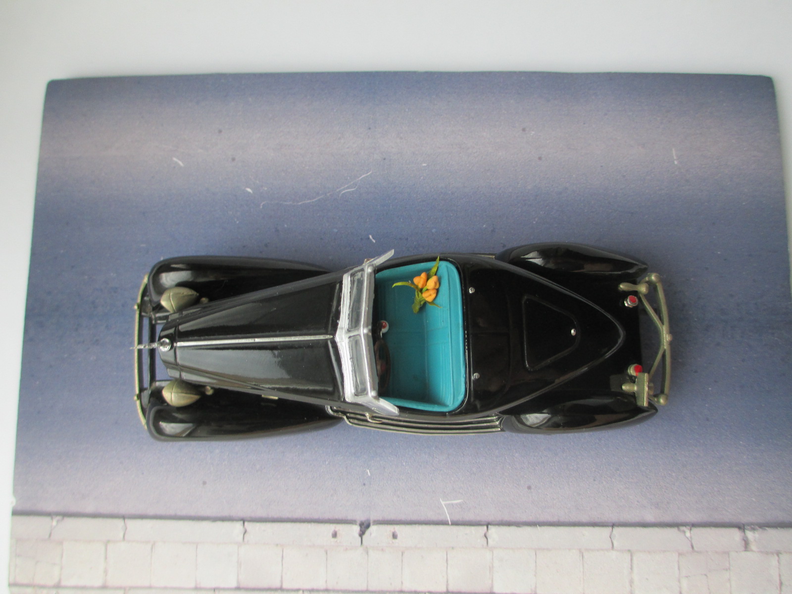 Спасибо за отзыв. 1934 Packard Twelve “Boattail” Runabout Speedster Le Baron Mini Marque (8а) Некоторым своим моделькам даю имена собственные. Паккард естественно получил имя "Бобтейл" (переиначенное по созвучью с “Boattail”) . Была раньше мода на кузова с лодочным дизайном. Поначалу было заартачился, не хотел брать этот Паккард в коллекцию, а теперь, думаю, будет одной из самых любимых, хотя редкостью не является. Реальный прототип от кузовного ателье Le Baron 1934 года очень редкий и дорогой. Моделька старенькая, требовала небольшого ремонта. Один мой хороший знакомый московский коллекционер помог с приобретением модели. Модель была в полуразобранном состоянии, некомплектная, местами затёртая. Восстановлены рама с лобовым стеклом, маскот, рычаг КПП, передние колёса. Пёс на днище и коробке хоть и неказистый, но милый. Любимая собака хозяина фирмы "Минимарк43". * Белый металл. Сделано в Англии. Вес модельки - 225 гр. P.S. Несмотря на обработку кузова анти-пылью, всё равно пыль пристаёт. Сорри. PP.S. Обычно я супруге цветы дарю, но тут она мне в дополнение к модели изготовила несколько букетиков тюльпанов. Хоть и переразмерены, но очень прелестные.
