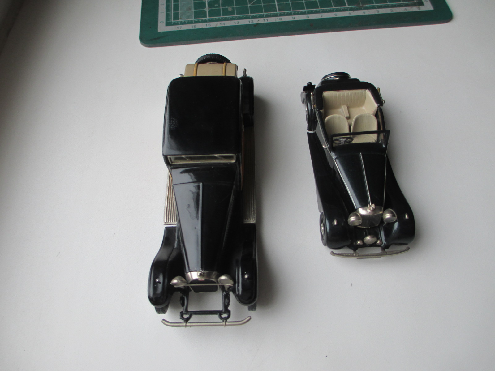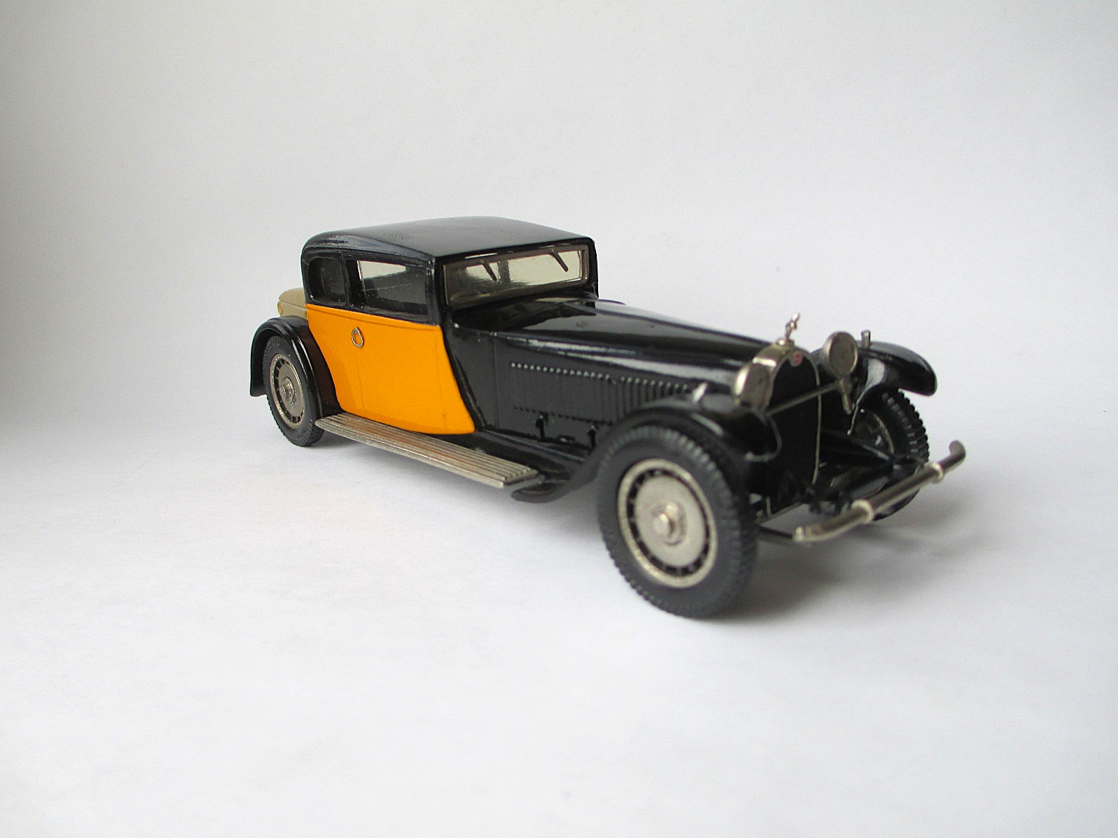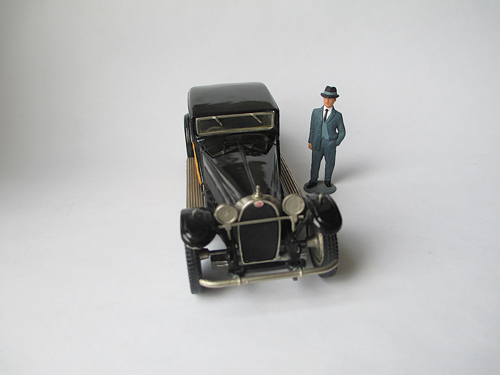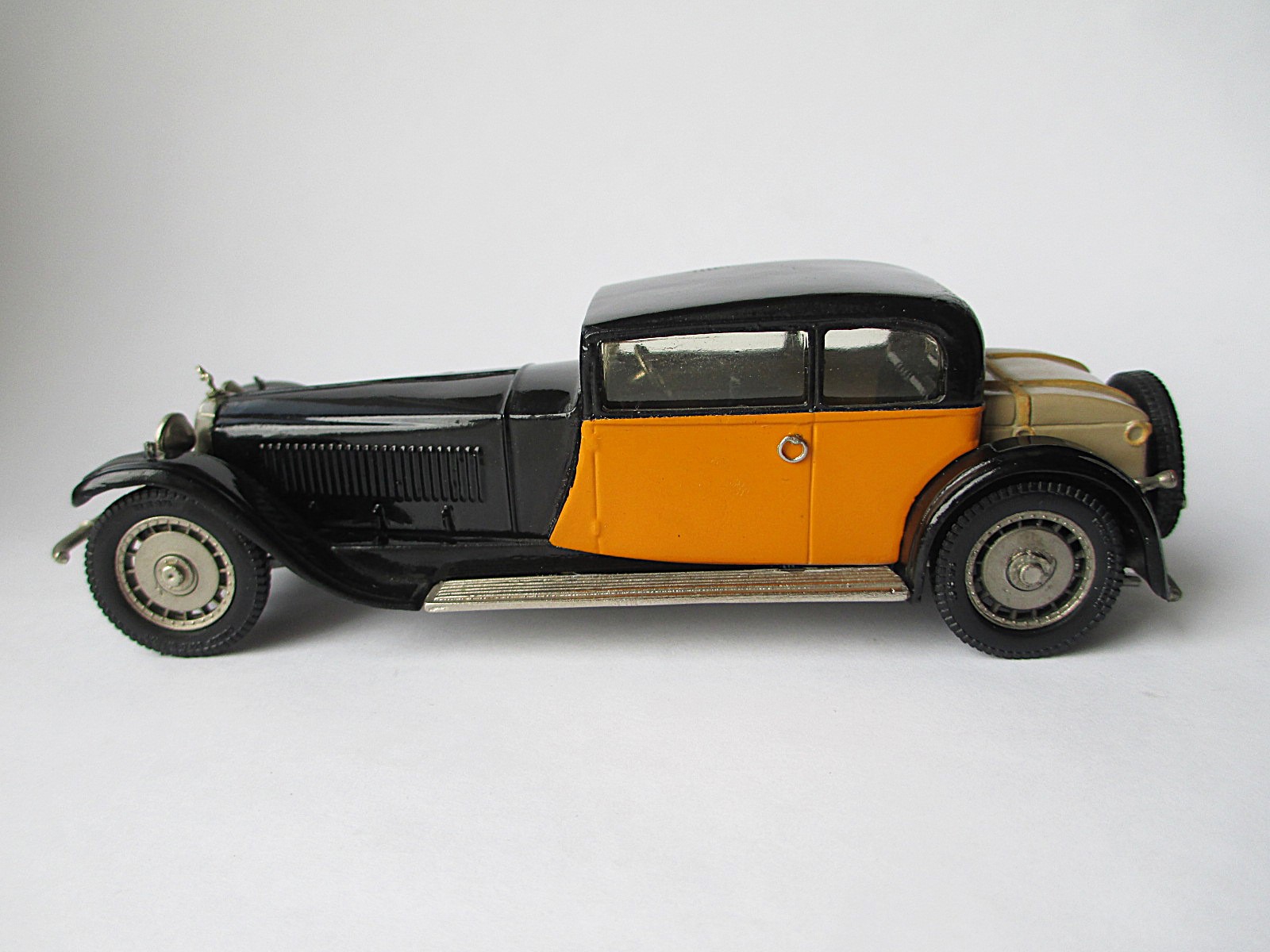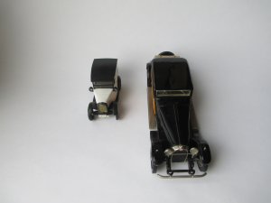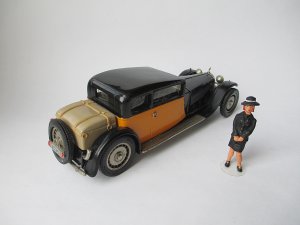 Bugatti Weymann Type 41 Prestige (PK 1) Модель 1929 года Royale Coach Chassis № 41100. Это приобретение ради установки личного рекорда по размерам легкового автомобиля. Модель реально огромная. Можете сравнить её с далеко немаленьким Bentley и маленьким Austin (см. фото). * Белый металл. Сделано во Франции. Вес модельки - 320 гр. Предпредыдущий владелец уделал её пылью, предыдущий хотел перепилить её в Bugatti Kellner. Но я подсуетился и не позволил производить над ней бесчеловечные эксперименты. Крыша имеет потёртости, найду хороший лак - шлифану крышу и заново задую лаком. Хотя можно оставить так, как есть. Повреждения не столь критичны. Сколько я не рассматривал изображений днища - на всех есть название модели и фирма производитель. На моей - дно гладкое, без надписей. Хотя дно родное. Короче мнений много, почему так вышло.