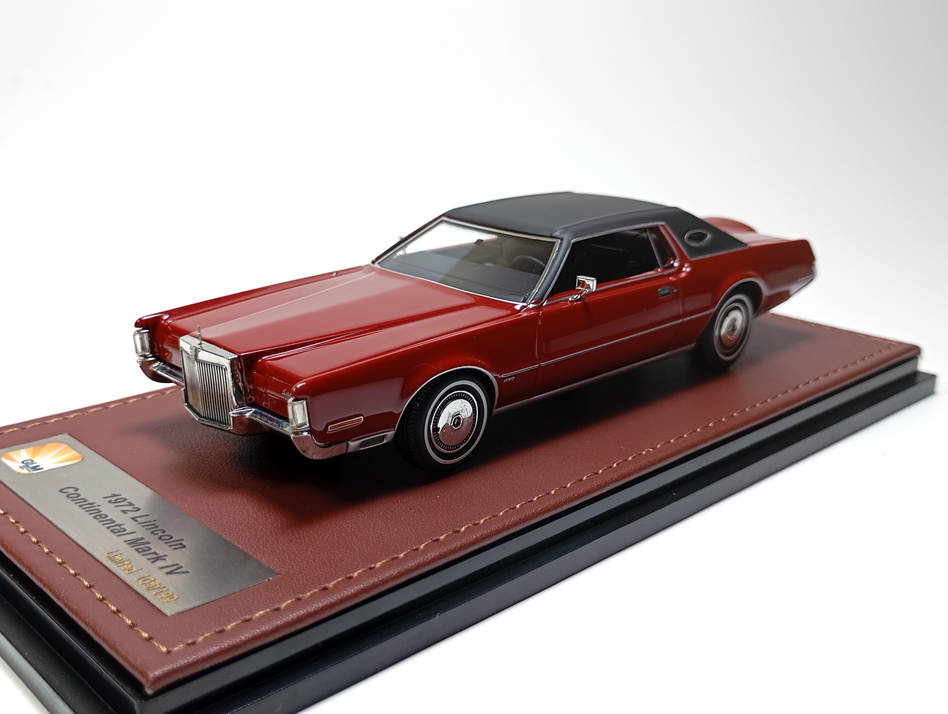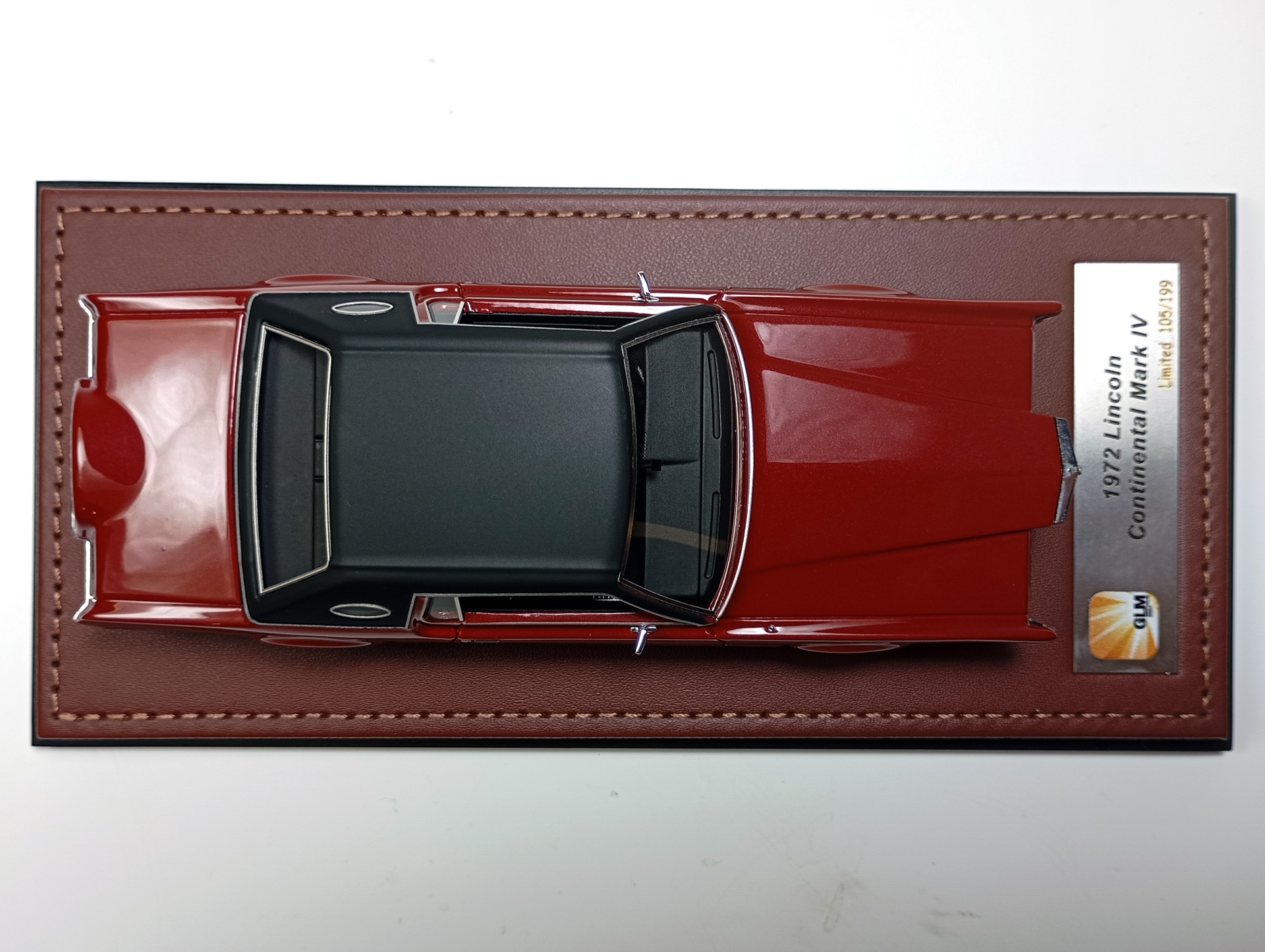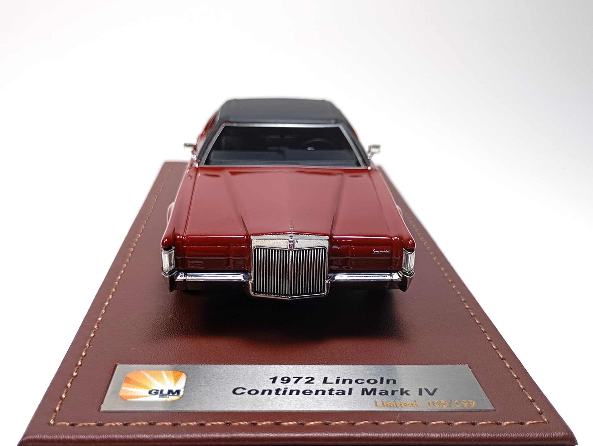 1/43 1972 Lincoln Continental Mark IV, цвет Red Moondust Poly, производитель GLM Models, артикул GLM102103, лимит 199 шт, год выпуска - 2025. Выкладываю первый из тройки Lincoln Mark IV от GLM. Четвертые марки раньше выходили у Neo, правда, более позднего 1973 года, со сплошным передним бампером. Был и темно-красный с черной крышей. У меня их нет, сравнивать могу только по фотографиям. На первый взгляд у Neo четвертые марки получились достаточно кривенькие, GLM-овские смотрятся получше. Лучше бы конечно выпустили что-то новое, но старых от Neo у меня нет, поэтому рад и этим. -