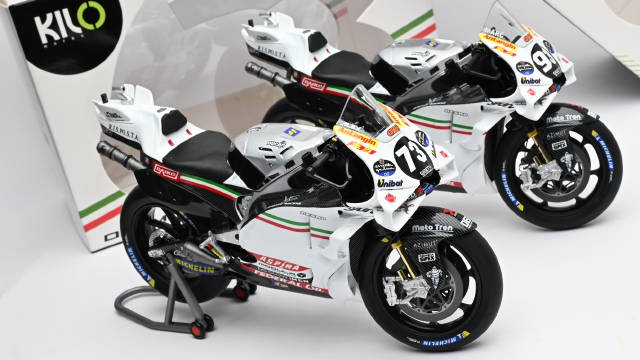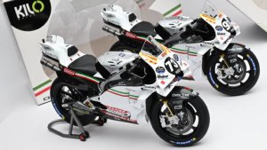 1/12. KILOworks. MotoGP Ducati motorcycle model in San Marino "White Horse". Модель оснащена подвижными передними и задними амортизаторами, поворотным рулём и кузовом из легкого сплава с лакированным покрытием. В комплекте подставка для кофра.