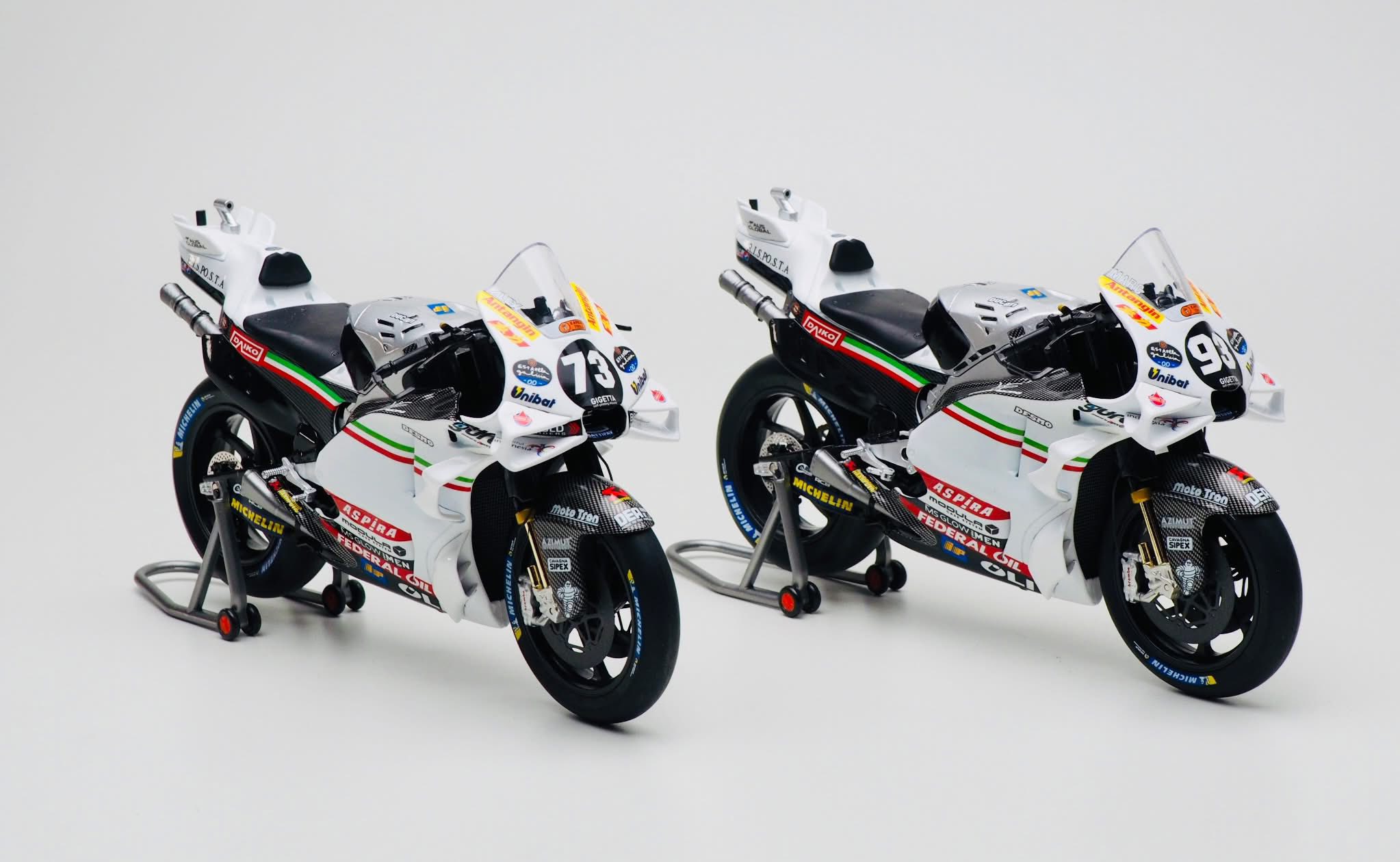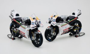 1/12. KILOworks. MotoGP Ducati motorcycle model in San Marino "White Horse". Модель оснащена подвижными передними и задними амортизаторами, поворотным рулём и кузовом из легкого сплава с лакированным покрытием. В комплекте подставка для кофра.