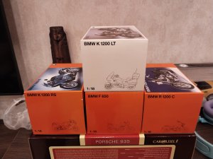 Всем, привет! Попробую оживить тему. Очень бы хотелось, чтобы интерес к данному форуму начал возвращаться. Решил показать не самый избитый на настоящее время экземпляр, но и не совсем автомобиля) Не так давно решил добавить к коллекции модели мотоциклов для оживляжа. Благо приличных моделей попадающих во временные рамки в 18ом масштабе можно пересчитать по пальцам двух рук с запасом: несколько старых моделей от Миничампс конца 90х годов и чуть меньше от Солидо, парочку из которых перевыпустил Норев не так давно. Итак: BMW K1200LT Champagner Metallic Minichamps for BMW 80439411781 -
