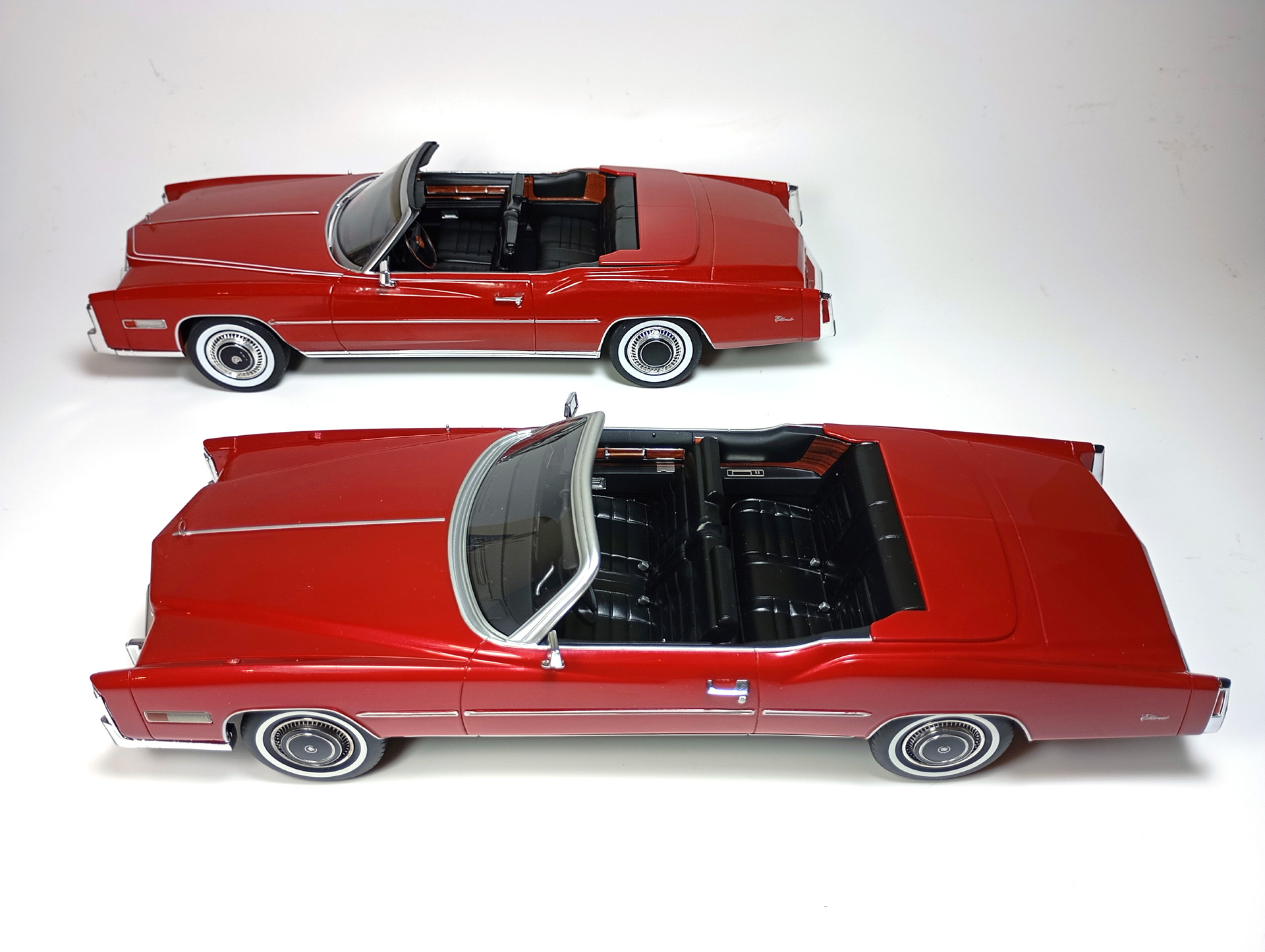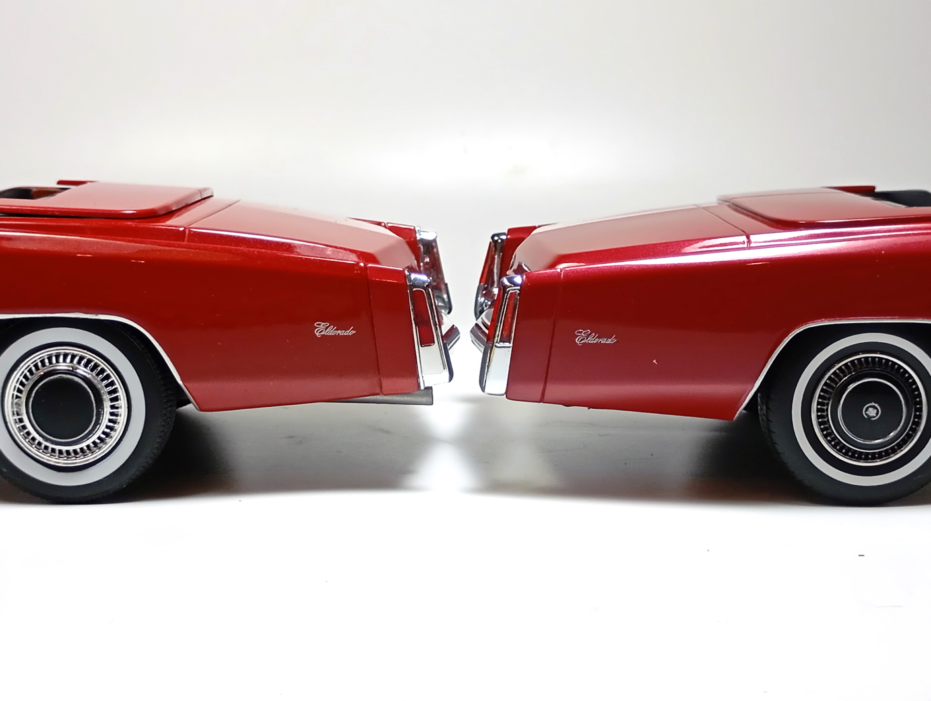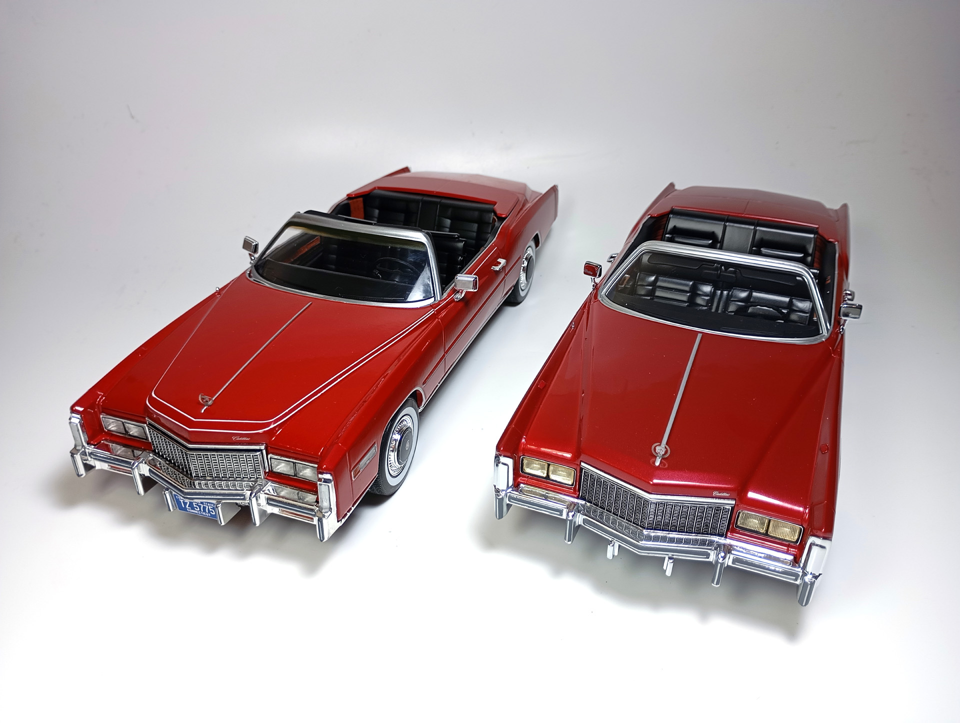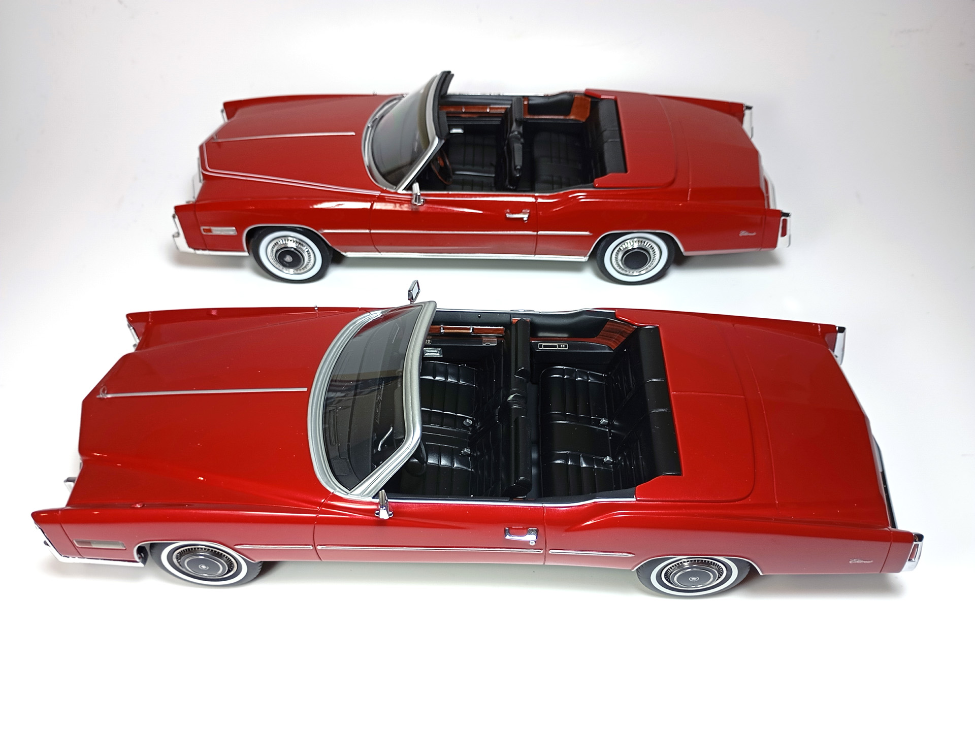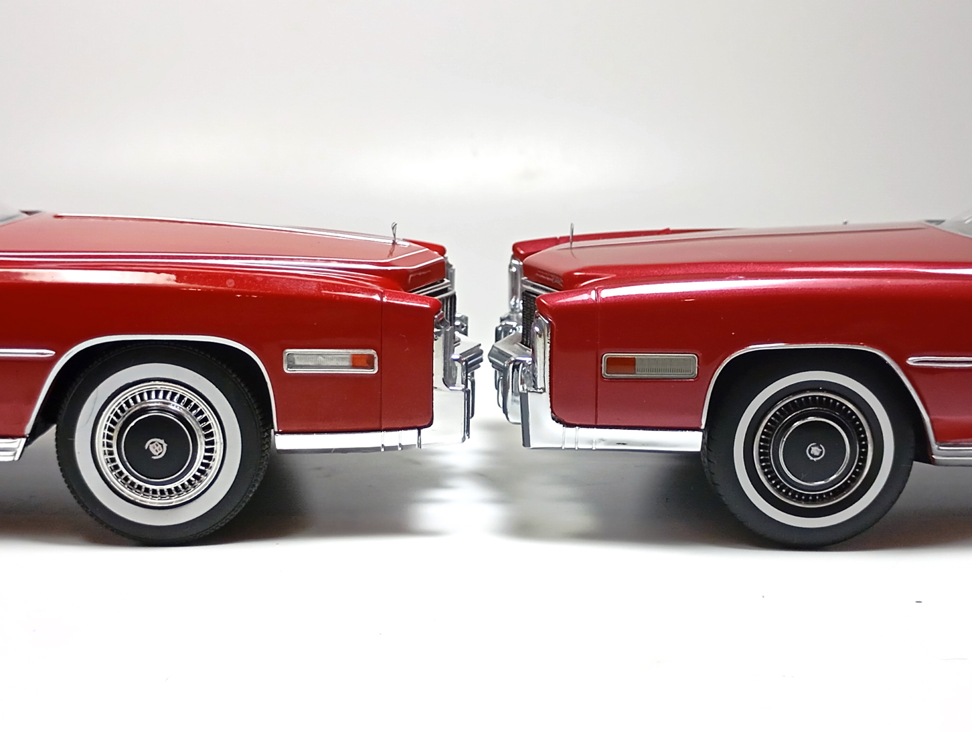 carcass Опубликовано: 14 часов назад Автор Жалоба Опубликовано: 14 часов назад 1/18 1976 Cadillac Eldorado convertible, цвет темно-красный металлик, производитель BoS Models, артикул BOS379, лимитированное издание 252 шт, год выпуска 2019. 1/18 1976 Cadillac Eldorado cabriolet open, красный, производитель MCG, артикул MCG18471, год выпуска - 2025. Ну и собственно сравнение. Обе модели, хоть и выпущены под разными брендами, но бренды принадлежат одной компании. Было бы логично использовать одну и ту же 3D-модель в производстве. Так, скорее всего и поступили, и это заметно. Общие очертания, пропорции, размеры у моделей одинаковы. Но есть отличия в деталях. Разработчики выполнили работу над ошибками и исправили то, что можно было исправить без радикальных переделок. Различия: - MCG - есть дворники под верхним краем капота, само небольшое пространство под кромкой капота у лобового стекла для глухой модели выглядит вполне реалистично. BoS - это пространство - залитая ванночка с ровными краями. Зато капот у MCG у лобового приподнят слишком высоко. - MCG - часть кузова, в которую убирается верх - горизонтальная, и это правильно. BoS - это место при виде сбоку имеет уклон назад. - BoS - передние габариты покрыты хромом, выглядят как клыки бампера. MCG - габариты выполнены из прозрачного пластика с рисунком. - MCG - колеса выпирают из арок, BoS - убраны в арки. - BoS - слишком радикальный загиб кузова внизу, у порогов. MCG - загиб не так ярко выражен, возможно, даже недостаточно сильный. - BoS - дверные карты хорошо проработаны, есть ручка отдельной деталью. MCG - карты упрощены, ручки обозначены цветом или вовсе отсутствуют. - BoS - лобовое завалено назад. MCG - правильный угол наклона лобового. - BoS - передние стойки полностью закрашены серебрянкой. MCG - внутренняя часть стоек прокрашена черным, как и должно быть. - BoS - педали покрашены серебрянкой. MCG - педали черные. - MCG - у решетки радиатора есть вертикальные молдинги по краям. BoS - вертикальные молдинги решетки отсутствуют. - MCG - поворотники желтые, как и было в 76 году. BoS - поворотники белые. (Мне больше нравится с желтыми). - MCG - обозначена подкапотная щель спереди. BoS - капот образует одно целое с кузовом. - MCG - лучше и аккуратнее сделана решетка радиатора. BoS - заливка кубиков неровная, есть непрокрасы. - MCG - съемный верх с остеклением и чехол сложенного верха на магнитах. (Почему так не делают на всех кабриолетах?) BoS - приклеенный чехол сложенного верха. - MCG - упаковка в блистер, модель прикручена к блистеру проволочками за мосты. BoS - упаковка в пенопластовый бокс, модель прикручена снизу черными саморезами по дереву, в половине случаев модель срывает при транспортировке (общая проблема всех моделей BoS) Основное отличие, которое для части коллекционеров может оказаться решающим - у BoS ровная покраска, с последующей полировкой. У MCG крупные капли от пистолета, которые, расплываясь, образуют неровную поверхность ("апельсиновая корка"). А в общем-то выбора никакого и нет. Модель BoS выпущена мизерным тиражом, давно раскуплена, осела по коллекциям и продается на eBay за непомерные деньги. Так что брать надо MCG, тут без вариантов. 1 Вячеслав Чесновский
