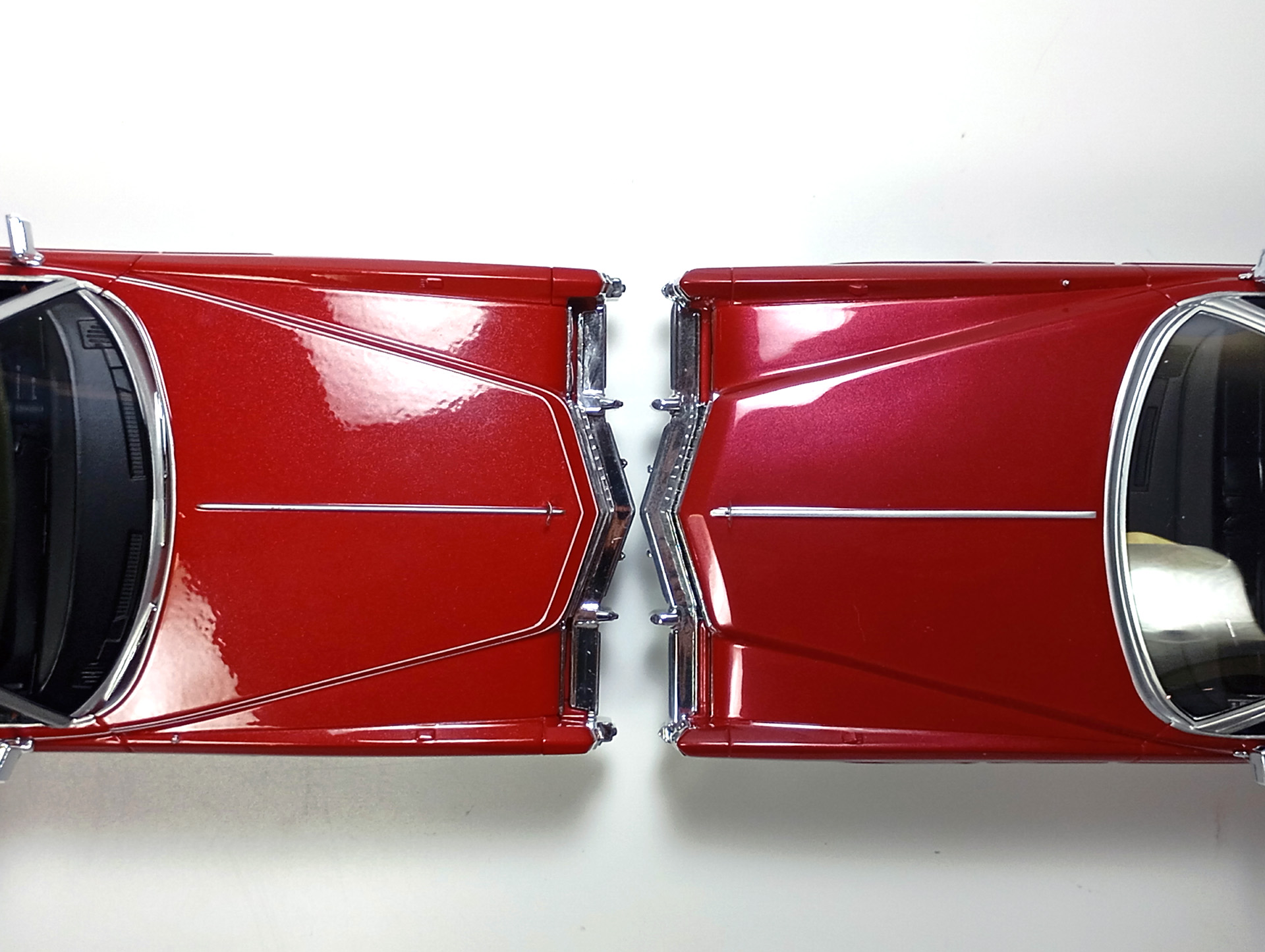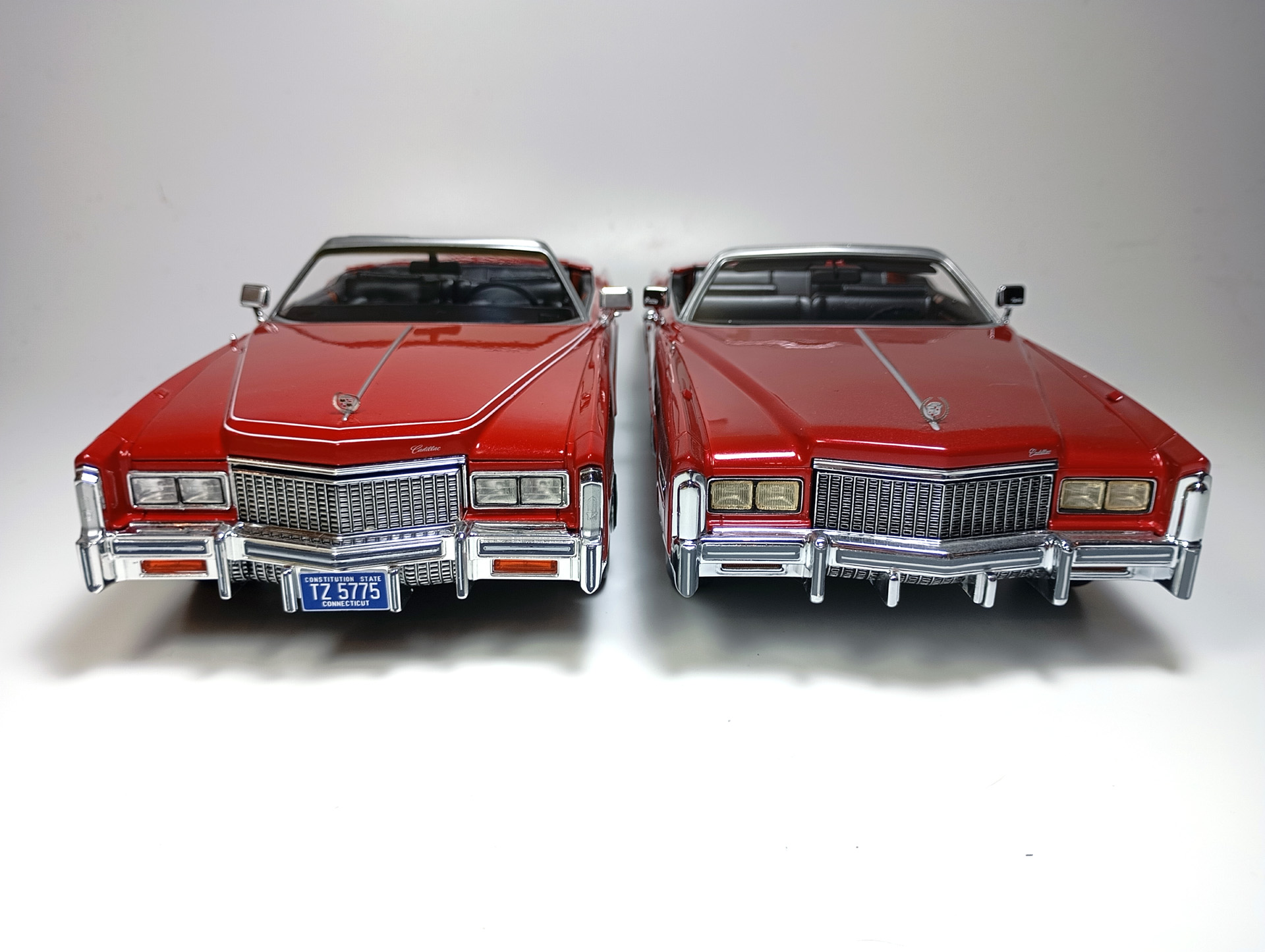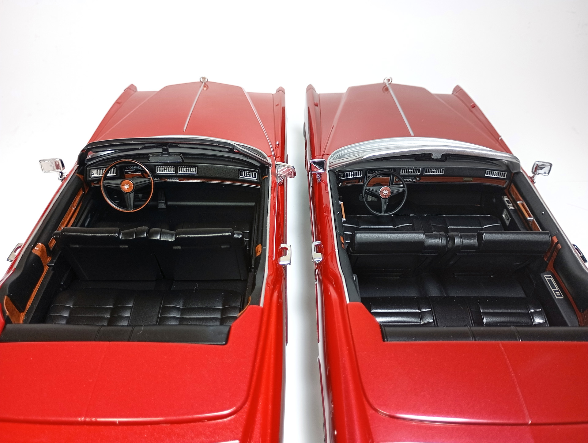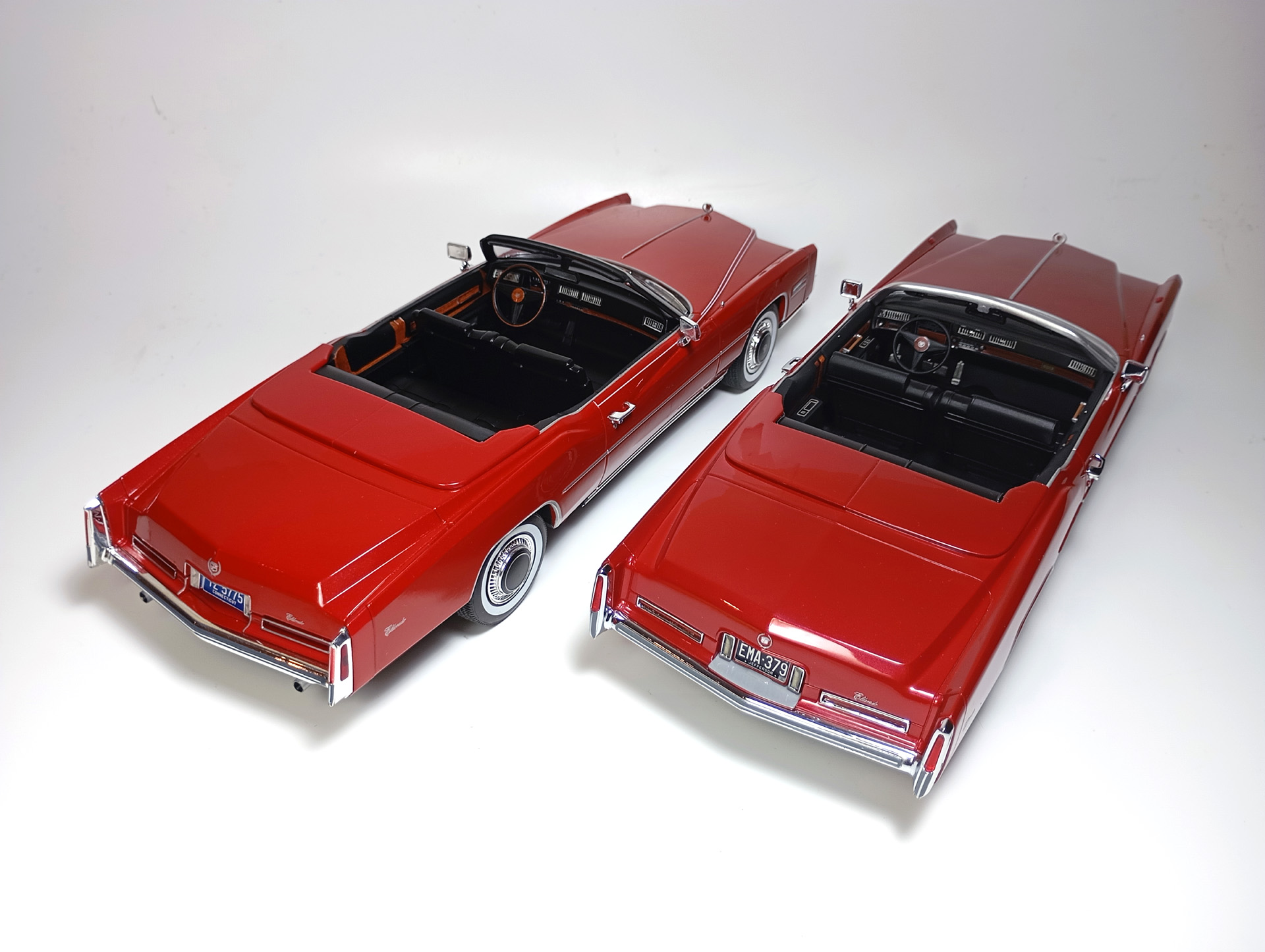 carcass Опубликовано: 14 часов назад Автор Жалоба Опубликовано: 14 часов назад 1/18 1976 Cadillac Eldorado convertible, цвет темно-красный металлик, производитель BoS Models, артикул BOS379, лимитированное издание 252 шт, год выпуска 2019. 1/18 1976 Cadillac Eldorado cabriolet open, красный, производитель MCG, артикул MCG18471, год выпуска - 2025. Ну и собственно сравнение. Обе модели, хоть и выпущены под разными брендами, но бренды принадлежат одной компании. Было бы логично использовать одну и ту же 3D-модель в производстве. Так, скорее всего и поступили, и это заметно. Общие очертания, пропорции, размеры у моделей одинаковы. Но есть отличия в деталях. Разработчики выполнили работу над ошибками и исправили то, что можно было исправить без радикальных переделок. Различия: - MCG - есть дворники под верхним краем капота, само небольшое пространство под кромкой капота у лобового стекла для глухой модели выглядит вполне реалистично. BoS - это пространство - залитая ванночка с ровными краями. Зато капот у MCG у лобового приподнят слишком высоко. - MCG - часть кузова, в которую убирается верх - горизонтальная, и это правильно. BoS - это место при виде сбоку имеет уклон назад. - BoS - передние габариты покрыты хромом, выглядят как клыки бампера. MCG - габариты выполнены из прозрачного пластика с рисунком. - MCG - колеса выпирают из арок, BoS - убраны в арки. - BoS - слишком радикальный загиб кузова внизу, у порогов. MCG - загиб не так ярко выражен, возможно, даже недостаточно сильный. - BoS - дверные карты хорошо проработаны, есть ручка отдельной деталью. MCG - карты упрощены, ручки обозначены цветом или вовсе отсутствуют. - BoS - лобовое завалено назад. MCG - правильный угол наклона лобового. - BoS - передние стойки полностью закрашены серебрянкой. MCG - внутренняя часть стоек прокрашена черным, как и должно быть. - BoS - педали покрашены серебрянкой. MCG - педали черные. - MCG - у решетки радиатора есть вертикальные молдинги по краям. BoS - вертикальные молдинги решетки отсутствуют. - MCG - поворотники желтые, как и было в 76 году. BoS - поворотники белые. (Мне больше нравится с желтыми). - MCG - обозначена подкапотная щель спереди. BoS - капот образует одно целое с кузовом. - MCG - лучше и аккуратнее сделана решетка радиатора. BoS - заливка кубиков неровная, есть непрокрасы. - MCG - съемный верх с остеклением и чехол сложенного верха на магнитах. (Почему так не делают на всех кабриолетах?) BoS - приклеенный чехол сложенного верха. - MCG - упаковка в блистер, модель прикручена к блистеру проволочками за мосты. BoS - упаковка в пенопластовый бокс, модель прикручена снизу черными саморезами по дереву, в половине случаев модель срывает при транспортировке (общая проблема всех моделей BoS) Основное отличие, которое для части коллекционеров может оказаться решающим - у BoS ровная покраска, с последующей полировкой. У MCG крупные капли от пистолета, которые, расплываясь, образуют неровную поверхность ("апельсиновая корка"). А в общем-то выбора никакого и нет. Модель BoS выпущена мизерным тиражом, давно раскуплена, осела по коллекциям и продается на eBay за непомерные деньги. Так что брать надо MCG, тут без вариантов. 1 Вячеслав Чесновский