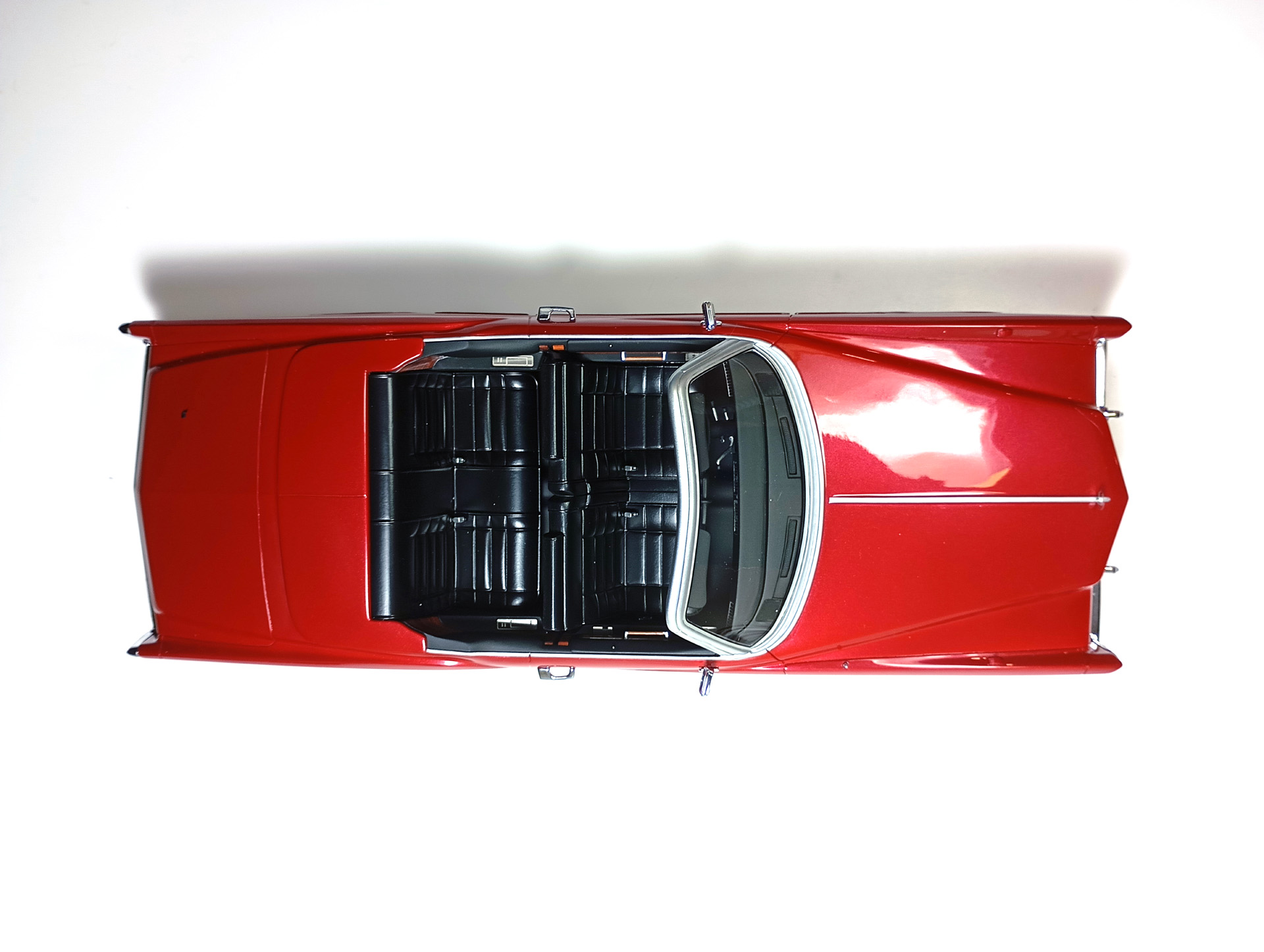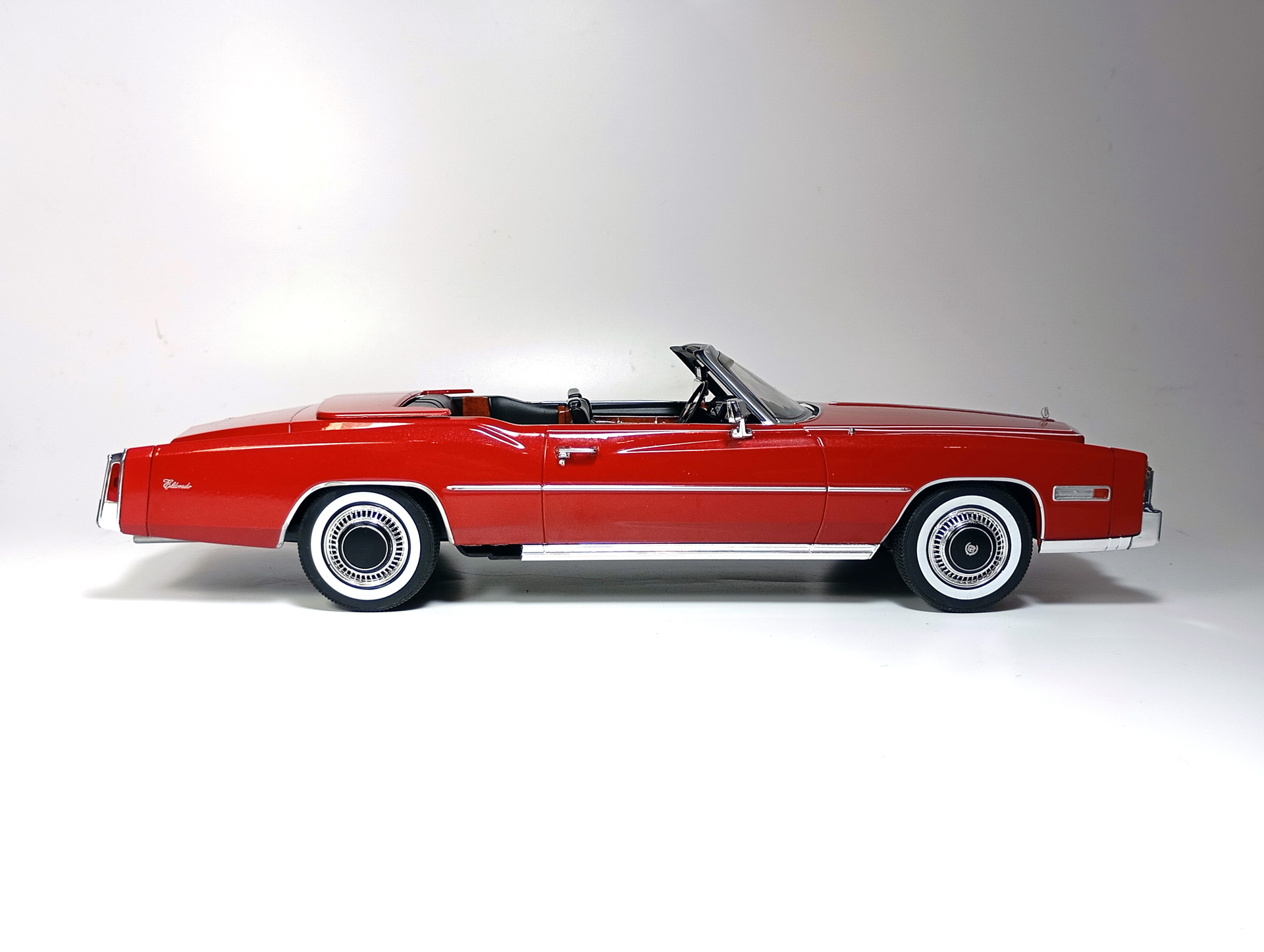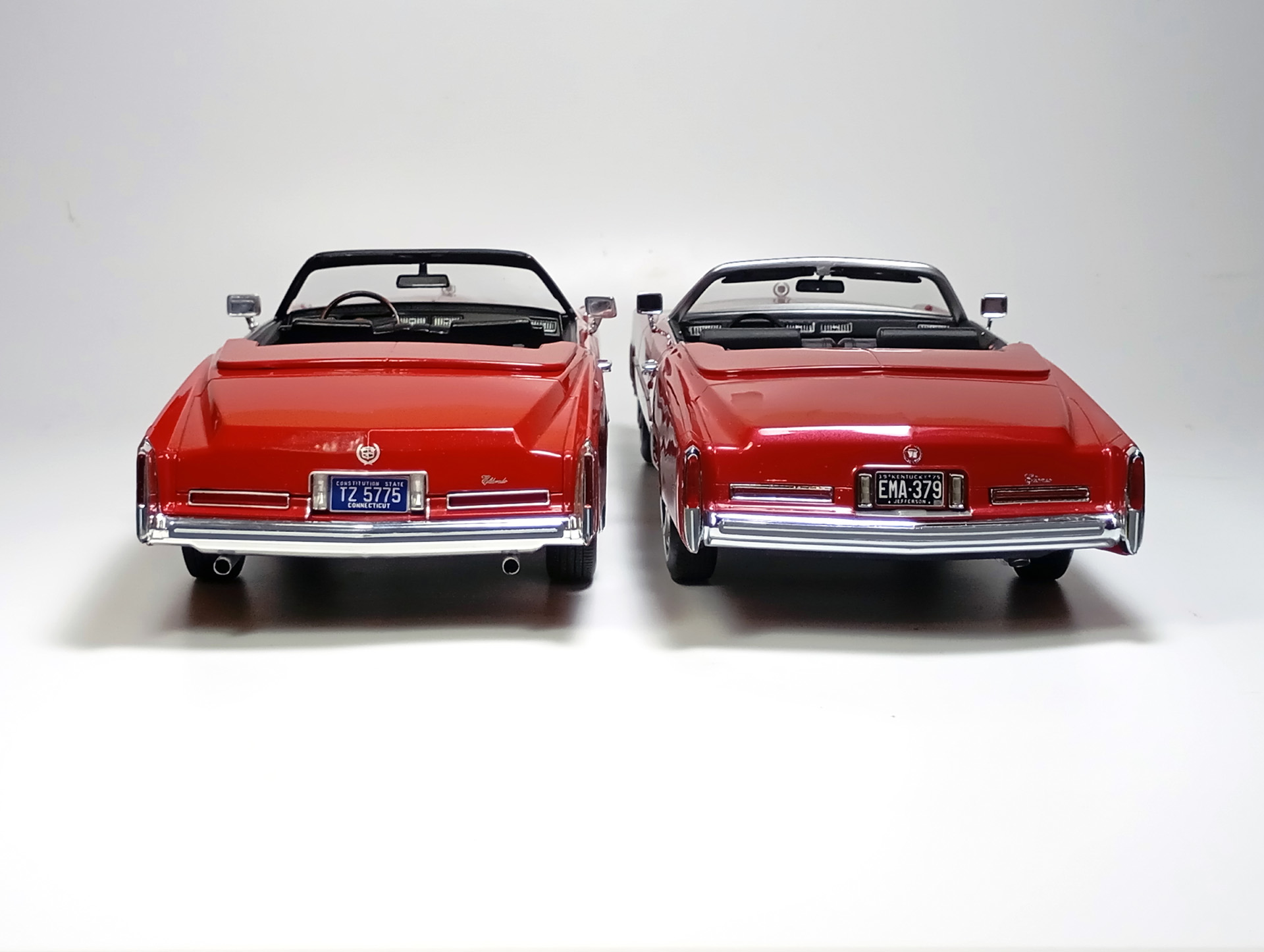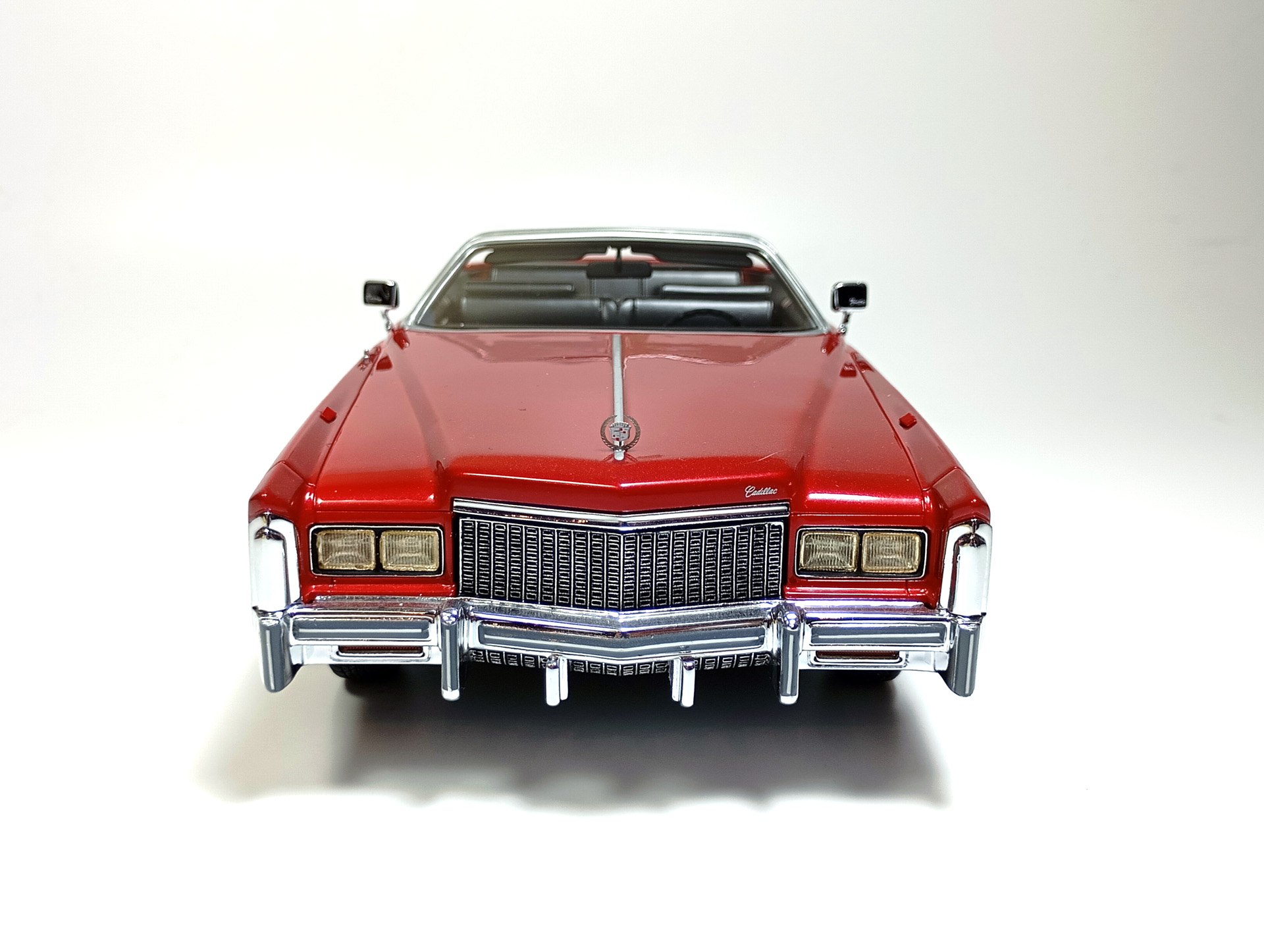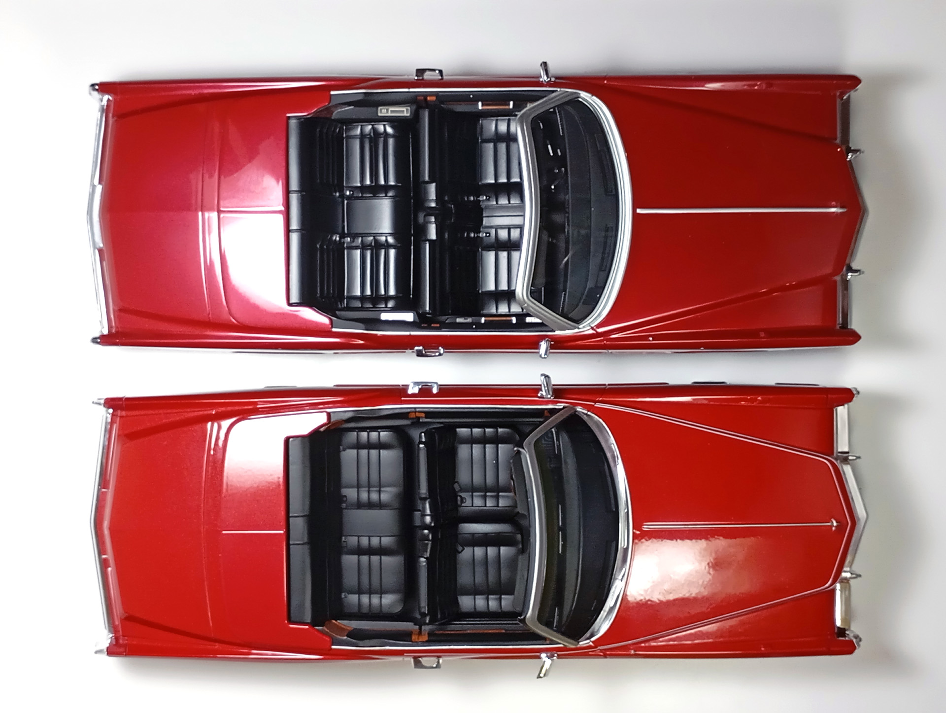carcass Опубликовано: 14 часов назад Автор Жалоба Опубликовано: 14 часов назад 1/18 1976 Cadillac Eldorado convertible, цвет темно-красный металлик, производитель BoS Models, артикул BOS379, лимитированное издание 252 шт, год выпуска 2019. 1/18 1976 Cadillac Eldorado cabriolet open, красный, производитель MCG, артикул MCG18471, год выпуска - 2025. Ну и собственно сравнение. Обе модели, хоть и выпущены под разными брендами, но бренды принадлежат одной компании. Было бы логично использовать одну и ту же 3D-модель в производстве. Так, скорее всего и поступили, и это заметно. Общие очертания, пропорции, размеры у моделей одинаковы. Но есть отличия в деталях. Разработчики выполнили работу над ошибками и исправили то, что можно было исправить без радикальных переделок. Различия: - MCG - есть дворники под верхним краем капота, само небольшое пространство под кромкой капота у лобового стекла для глухой модели выглядит вполне реалистично. BoS - это пространство - залитая ванночка с ровными краями. Зато капот у MCG у лобового приподнят слишком высоко. - MCG - часть кузова, в которую убирается верх - горизонтальная, и это правильно. BoS - это место при виде сбоку имеет уклон назад. - BoS - передние габариты покрыты хромом, выглядят как клыки бампера. MCG - габариты выполнены из прозрачного пластика с рисунком. - MCG - колеса выпирают из арок, BoS - убраны в арки. - BoS - слишком радикальный загиб кузова внизу, у порогов. MCG - загиб не так ярко выражен, возможно, даже недостаточно сильный. - BoS - дверные карты хорошо проработаны, есть ручка отдельной деталью. MCG - карты упрощены, ручки обозначены цветом или вовсе отсутствуют. - BoS - лобовое завалено назад. MCG - правильный угол наклона лобового. - BoS - передние стойки полностью закрашены серебрянкой. MCG - внутренняя часть стоек прокрашена черным, как и должно быть. - BoS - педали покрашены серебрянкой. MCG - педали черные. - MCG - у решетки радиатора есть вертикальные молдинги по краям. BoS - вертикальные молдинги решетки отсутствуют. - MCG - поворотники желтые, как и было в 76 году. BoS - поворотники белые. (Мне больше нравится с желтыми). - MCG - обозначена подкапотная щель спереди. BoS - капот образует одно целое с кузовом. - MCG - лучше и аккуратнее сделана решетка радиатора. BoS - заливка кубиков неровная, есть непрокрасы. - MCG - съемный верх с остеклением и чехол сложенного верха на магнитах. (Почему так не делают на всех кабриолетах?) BoS - приклеенный чехол сложенного верха. - MCG - упаковка в блистер, модель прикручена к блистеру проволочками за мосты. BoS - упаковка в пенопластовый бокс, модель прикручена снизу черными саморезами по дереву, в половине случаев модель срывает при транспортировке (общая проблема всех моделей BoS) Основное отличие, которое для части коллекционеров может оказаться решающим - у BoS ровная покраска, с последующей полировкой. У MCG крупные капли от пистолета, которые, расплываясь, образуют неровную поверхность ("апельсиновая корка"). А в общем-то выбора никакого и нет. Модель BoS выпущена мизерным тиражом, давно раскуплена, осела по коллекциям и продается на eBay за непомерные деньги. Так что брать надо MCG, тут без вариантов. 1 Вячеслав Чесновский