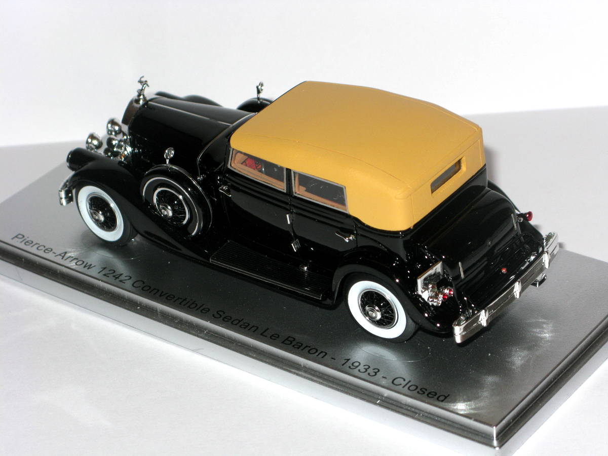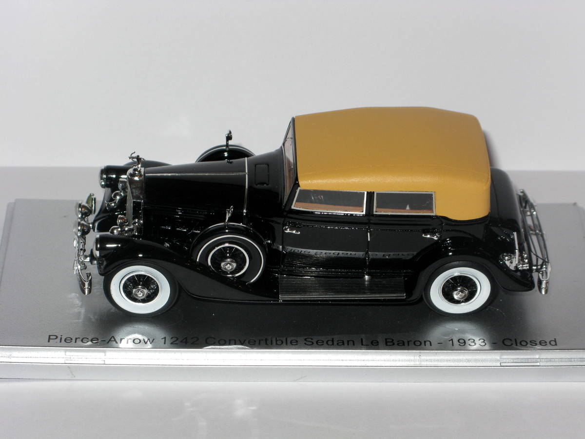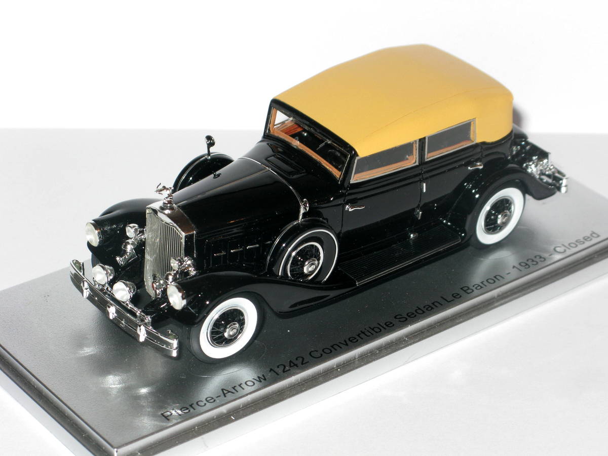 ГригорийМ Опубликовано: 3 часа назад Автор Жалоба Опубликовано: 3 часа назад Pierce Arrow 1242 Convertible Sedan Le Baron 1933 KESS-MODEL KE43059003 Надо написать, что к этой модели есть вопросы о существовании прототипа. Пару лет назад Kess анонсировал три таких Пирса Эрроу. Зелёный, который существует в наше время, Серо/синий, который тоже известен и этот чёрный Чёрный с такой жёлтой крышей тоже есть, но он на длиннобазной модификации, а тут база короткая. Приходится надеяться, что в 30-е годы кто-то заказывал этот престижный двенадцатицилиндровый кабриолет и в чёрном цвете и на короткой базе. 1 Моя коллекция ГерманияМоя коллекция Америка